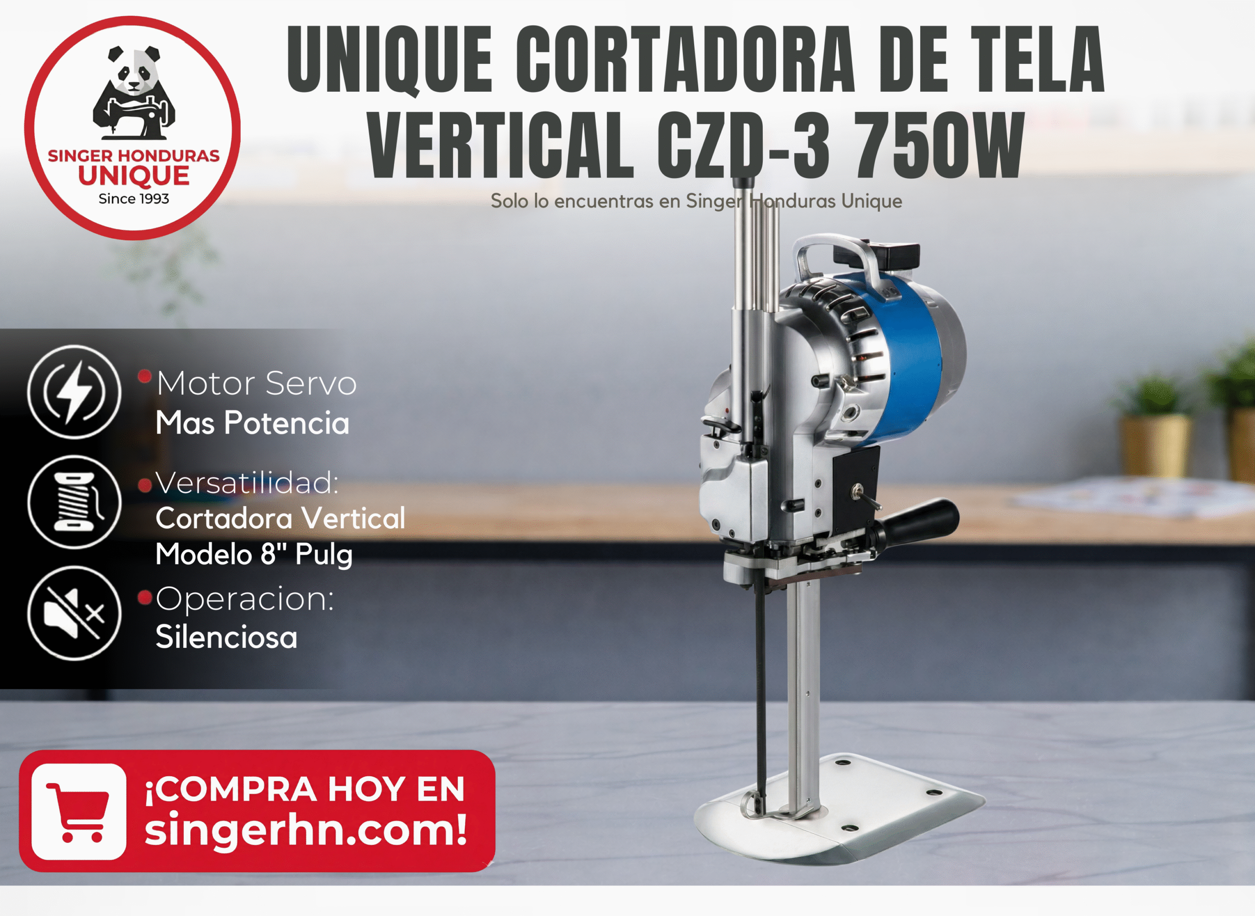 La UNIQUE CZD-3 8″ es una cortadora vertical de cuchilla recta, desarrollada para el corte de telas en tendidos múltiples, ideal para talleres de confección, fábricas textiles y marroquinería. Su cuchilla de 8 pulgadas (≈ 203 mm), motor de 750 W, sistema de afilado automático con bandas y base de bajo perfil facilitan cortes limpios, rápidos y de gran capacidad, tanto en telas ligeras como densas — desde algodón hasta cuero sintético.