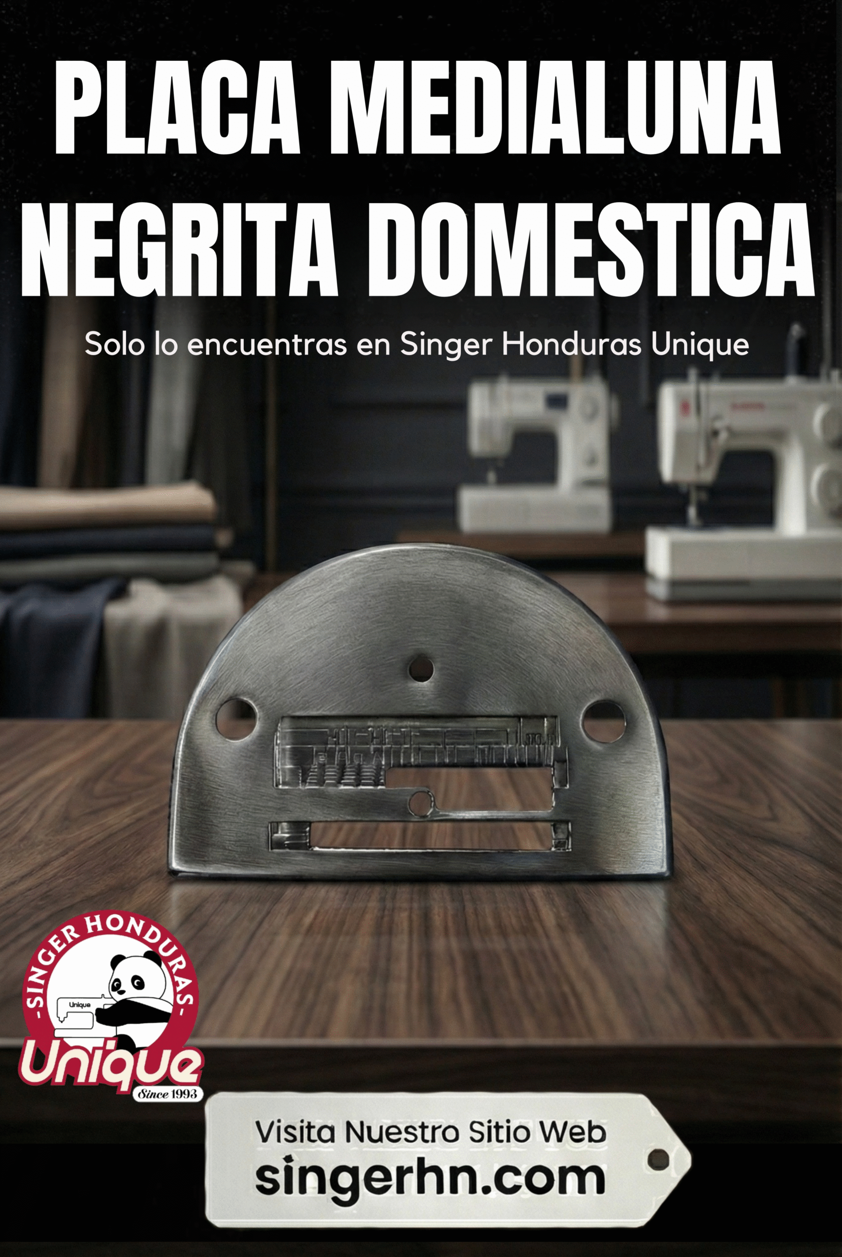 La placa medialuna Negrita es una placa de aguja guía con forma curva tipo medialuna diseñada para las máquinas de coser domésticas modelo Singer Negrita (y otras máquinas antiguas con diseño similar).