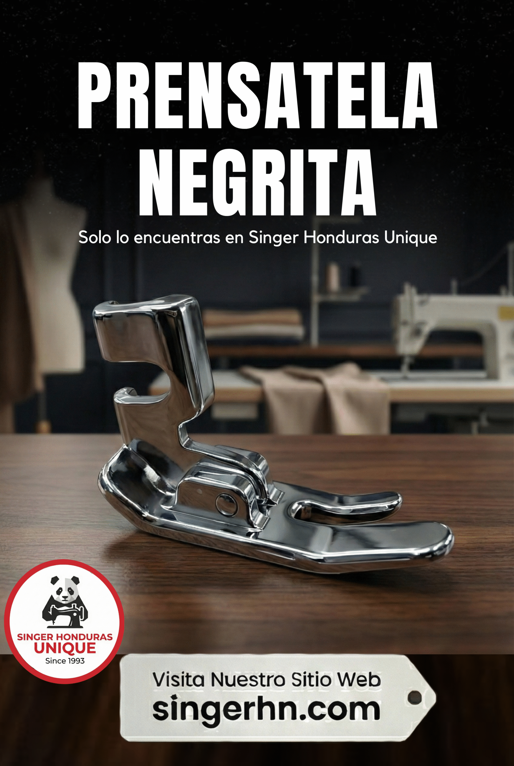 El prensatela Negrita es el prensatela estándar utilizado en las máquinas de coser domésticas Singer Negrita (clásicas). Su función principal es sujetar la tela firmemente contra los dientes de arrastre, permitiendo que la costura avance de forma uniforme, estable y precisa.
