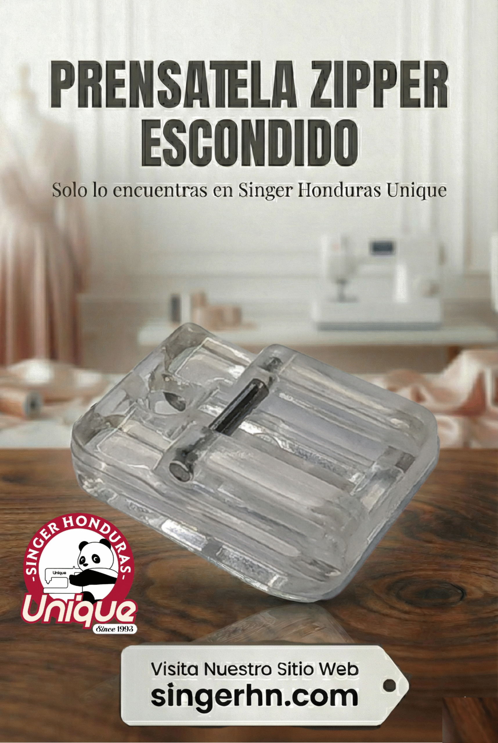 El prensatela para zipper escondido desmontable plástico está diseñado para coser cierres invisibles (zipper escondido) de forma precisa y profesional. Sus canales guía permiten abrir y sostener los dientes del cierre mientras se cose, logrando que el zipper desaparezca en la costura.
